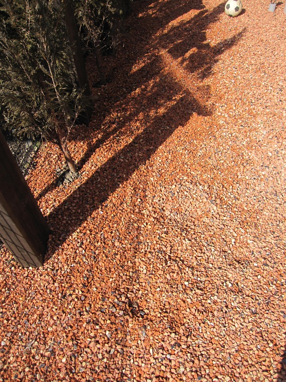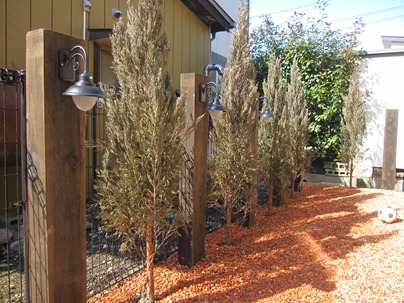 南側の境界にはクリーンマクラギを立て、その間にコニファーを植えて、塀代わりにしました。 クリーンマクラギにはLEDのガーデンウォールライトを取り付けています。残された庭のスペースは、庭の管理が楽なようにテコラ(破砕瓦)を敷きこんでいます。テコラを敷きこんでおけば、芝生のような刈込や草取りの手間が掛からず、楽な上に見た目にも綺麗です。