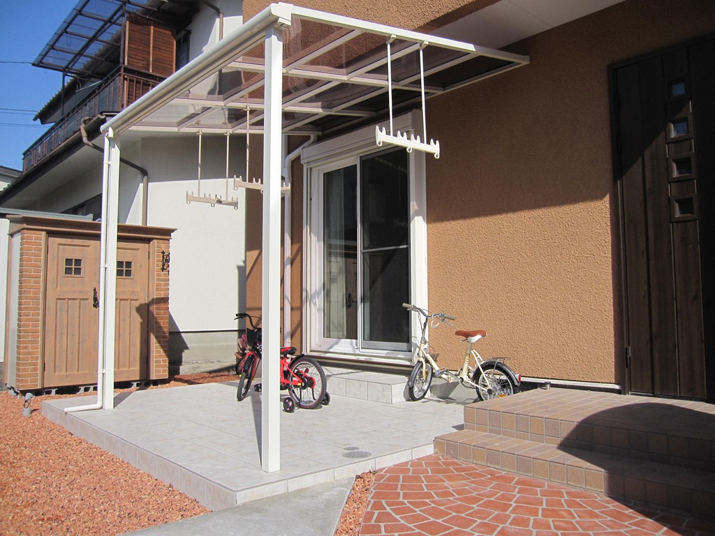 リビングの前にはホワイトのアルミテラスを取り付けています。テラス下は土間コンクリートを打って仕上げ、自転車置き場にしたり洗濯物を干したりして、いろんな用途に使う事ができます。
