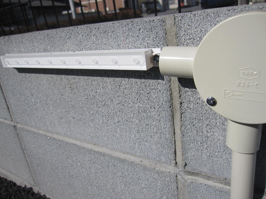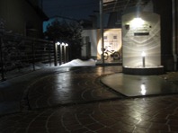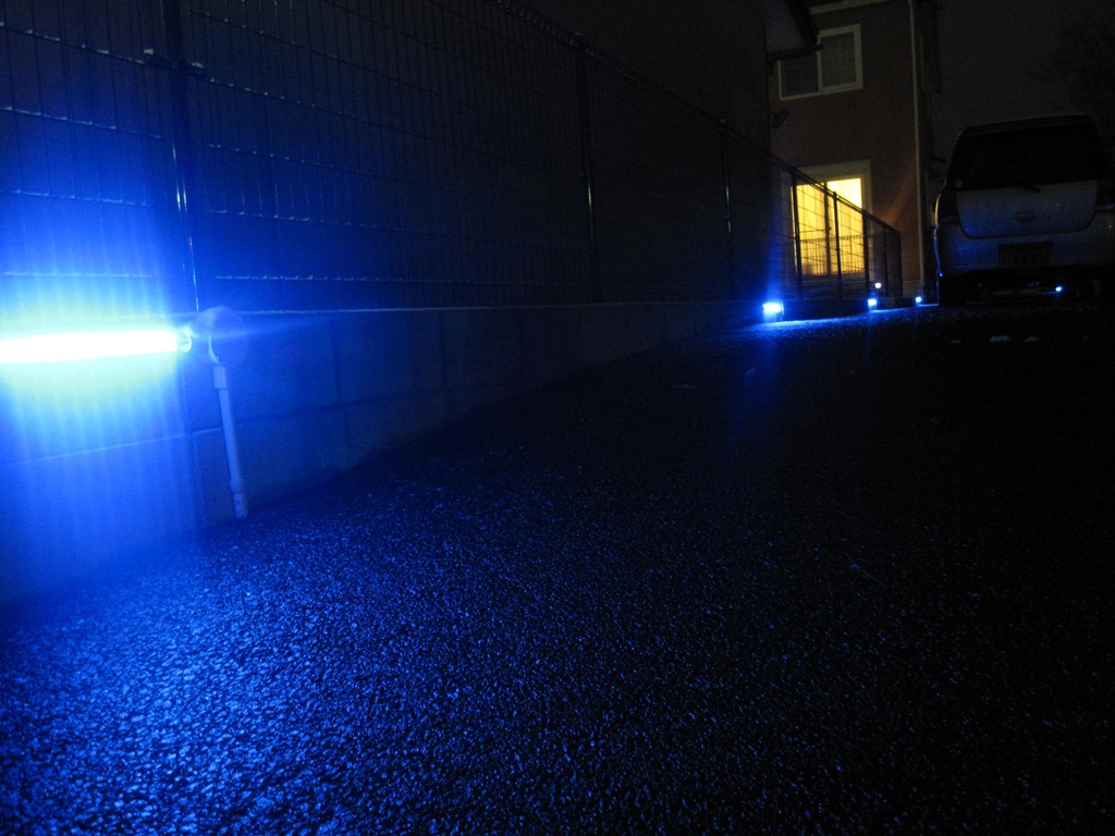 夜になり暗くなるとDCトランスの働きで自動点灯したLED照明があたりを明るく照らします。駐車場を照らすLEDバーはブルーカラーです。