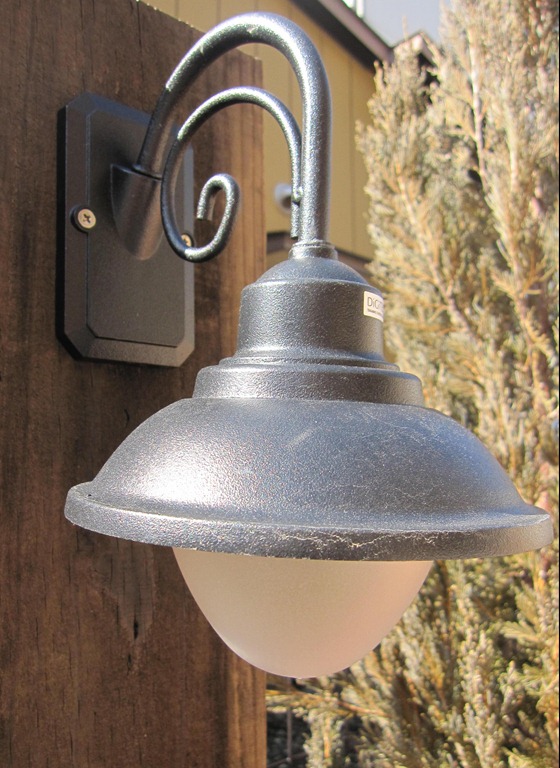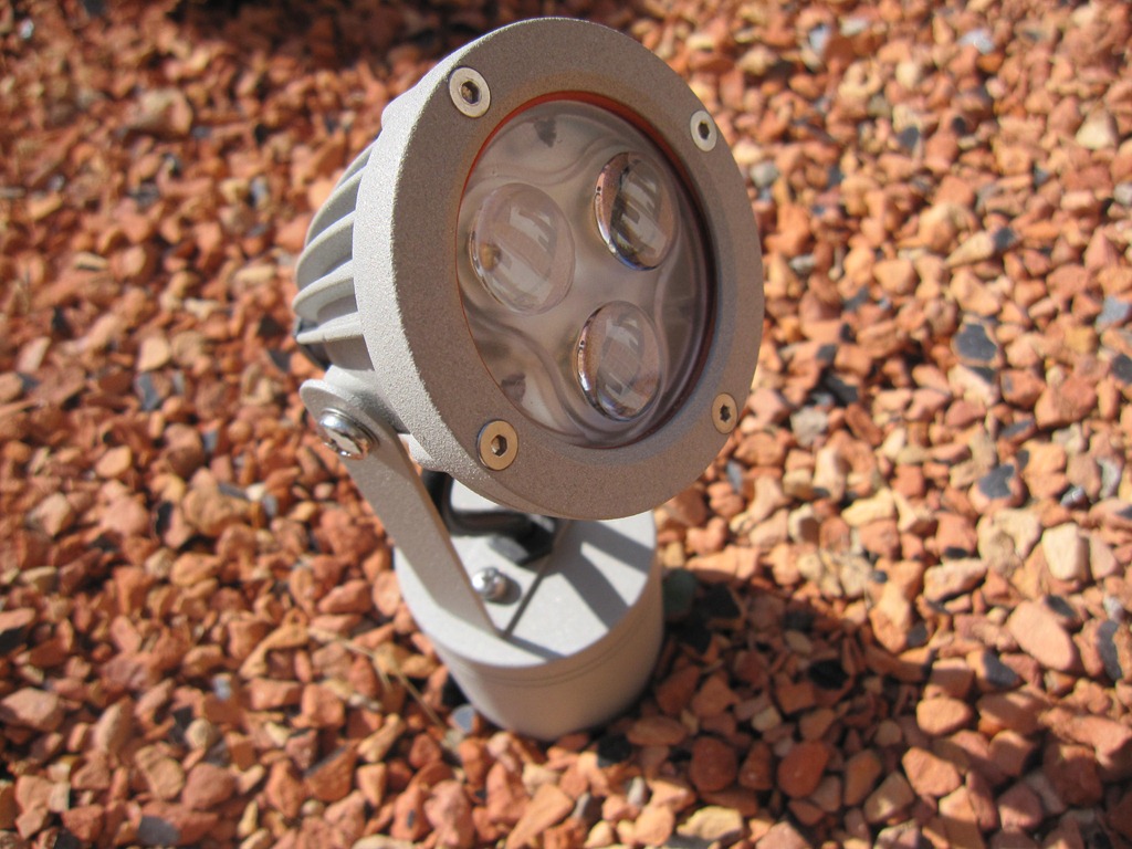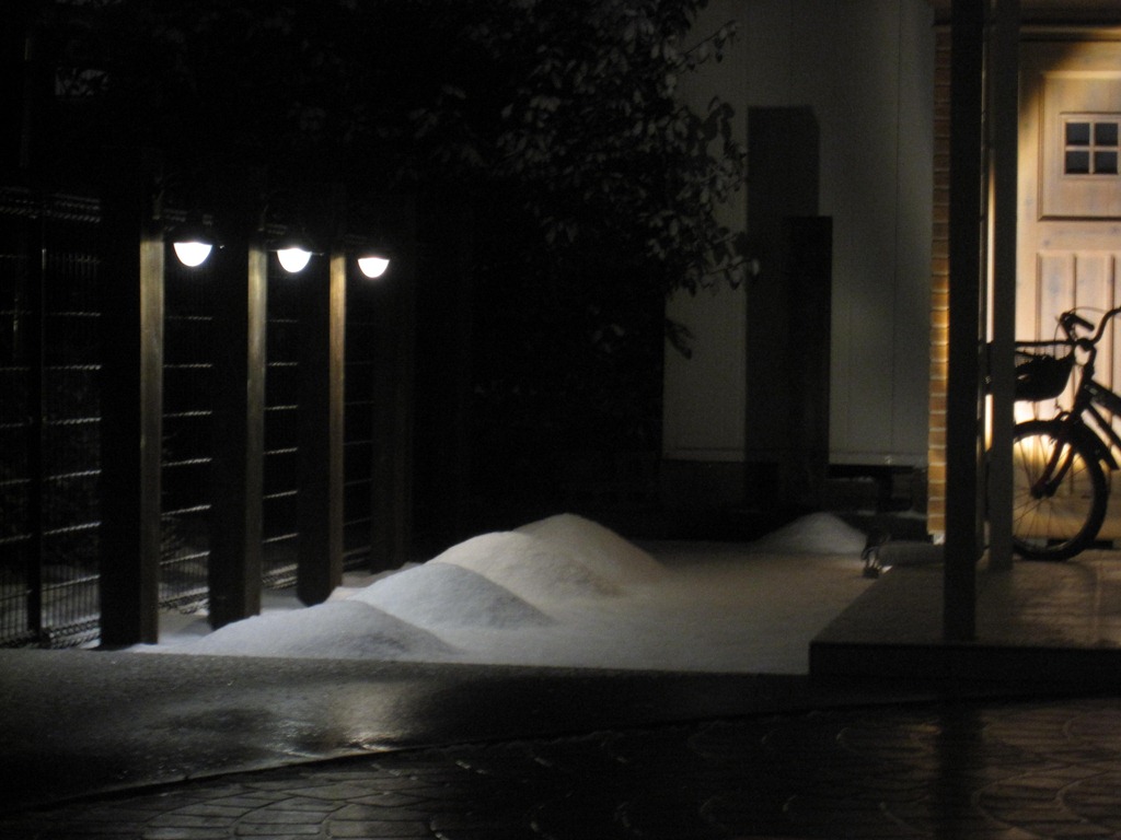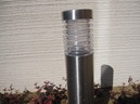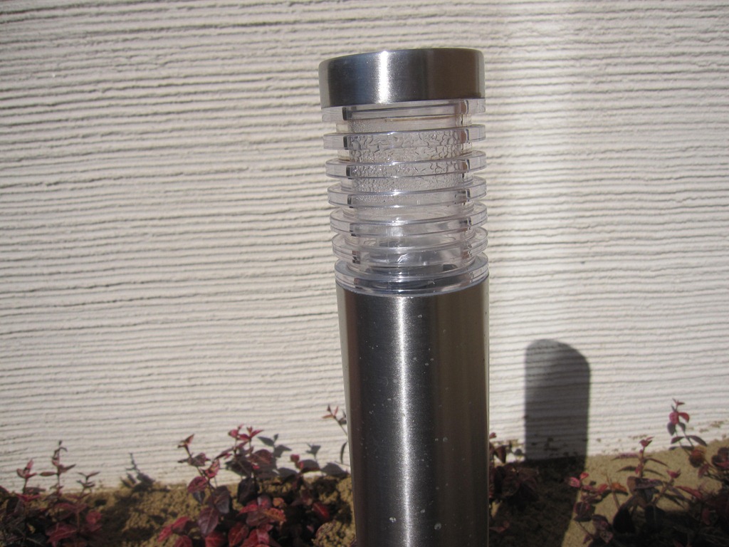 点灯する前のLED照明です。左から、花壇の中に入れたガーデンポールライト、カンナ物置をライトアップするパワーLEDマルチアップライト、マクラギに取り付けたガーデンウォールライト、ブルーのLEDバー、ディーズガーデンの表札灯