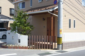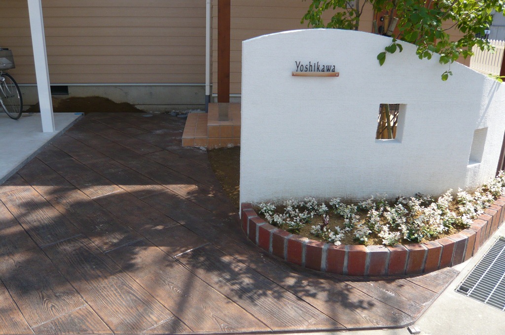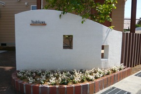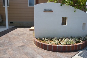 門柱のサインは、陶器と金属文字の組み合わせたディーズガーデンのC-08です。門柱横の通路は、当社オリジナル