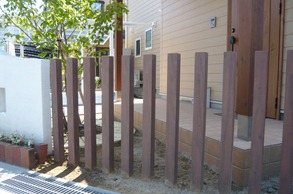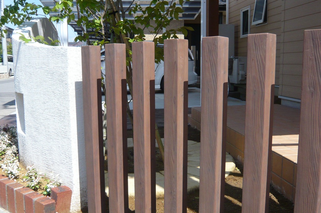 門柱横の角柱のティンバーは、表面に凹凸があり本物の木のように見えますが、FRP製なので耐久性があり、