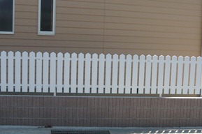 西側の境界は、ベースコンクリートを打ち、白いアメリカンフェンスを取り付けています。南側のリビングの前には
