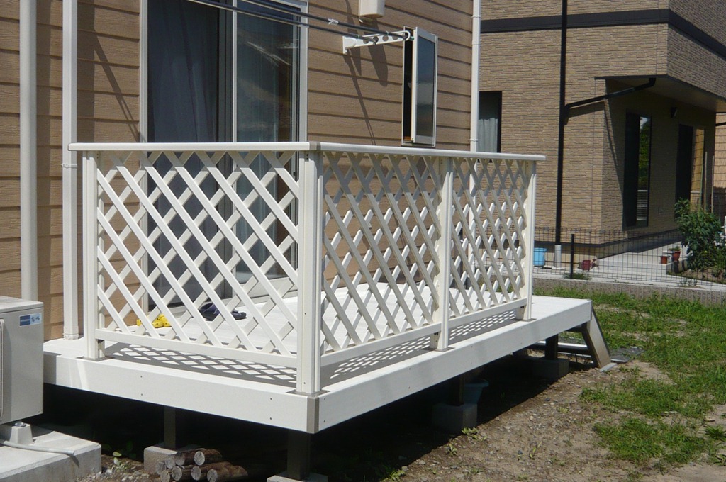 ホワイトの木樹脂デッキに、白いラティスフェンスを取り付けています。