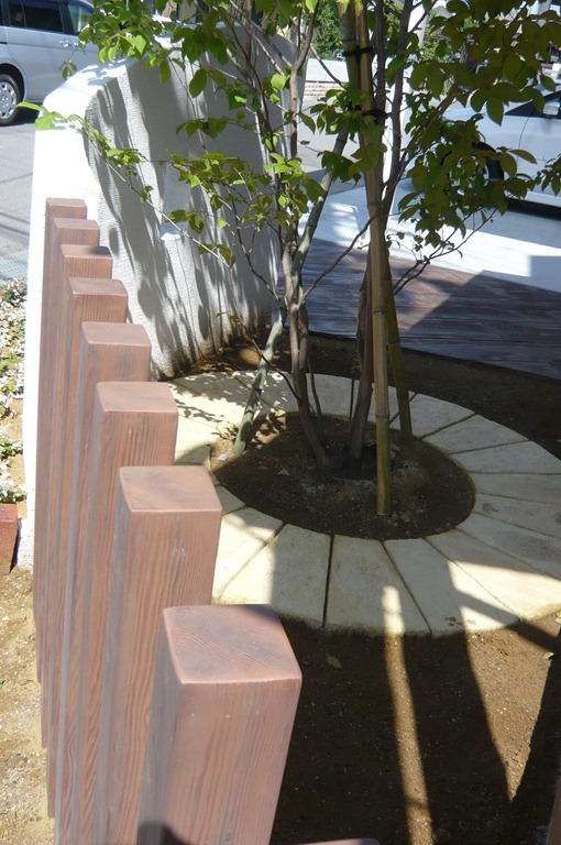 手前にはレンガを立てて花壇にし、常緑のハツユキカズラを植えています。敷地の隅切りになっている場所には、