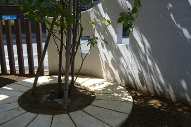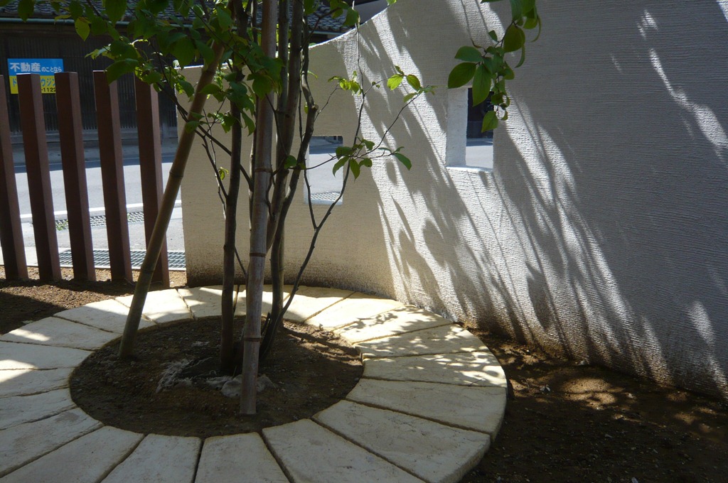 門柱と玄関の間にサークルを敷き、センターにはシンボルツリーのシャラ株立を植えています。