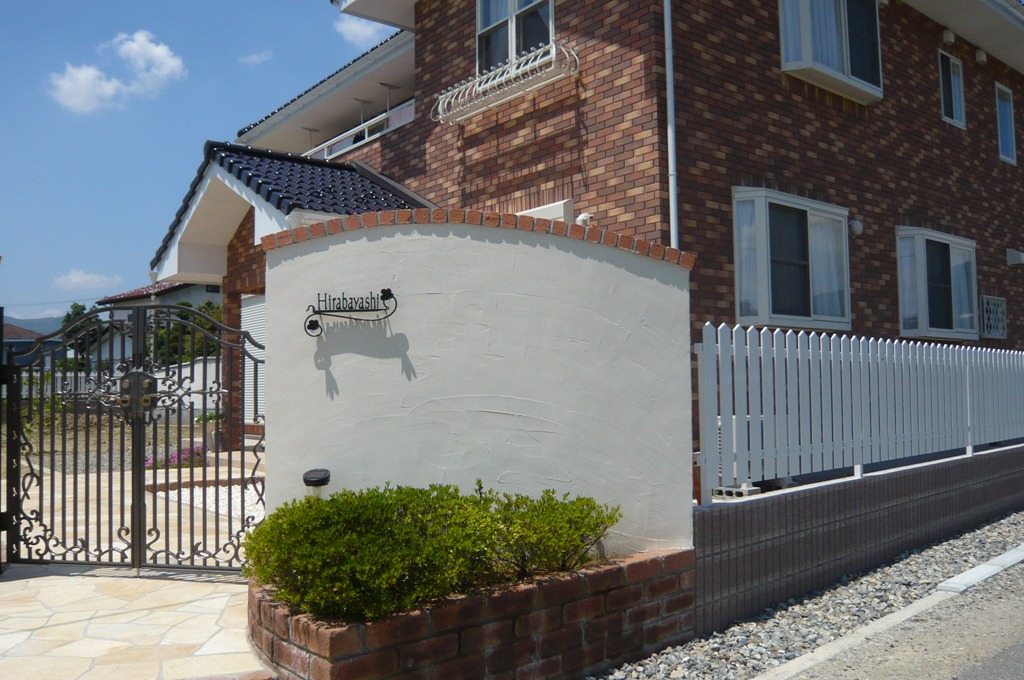 門柱前のレンガを積んだ花壇の高さを右と左で変え、天然石貼りのアプローチを曲線を描きながら玄関まで