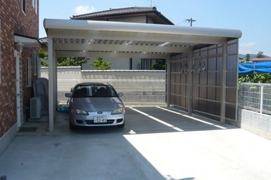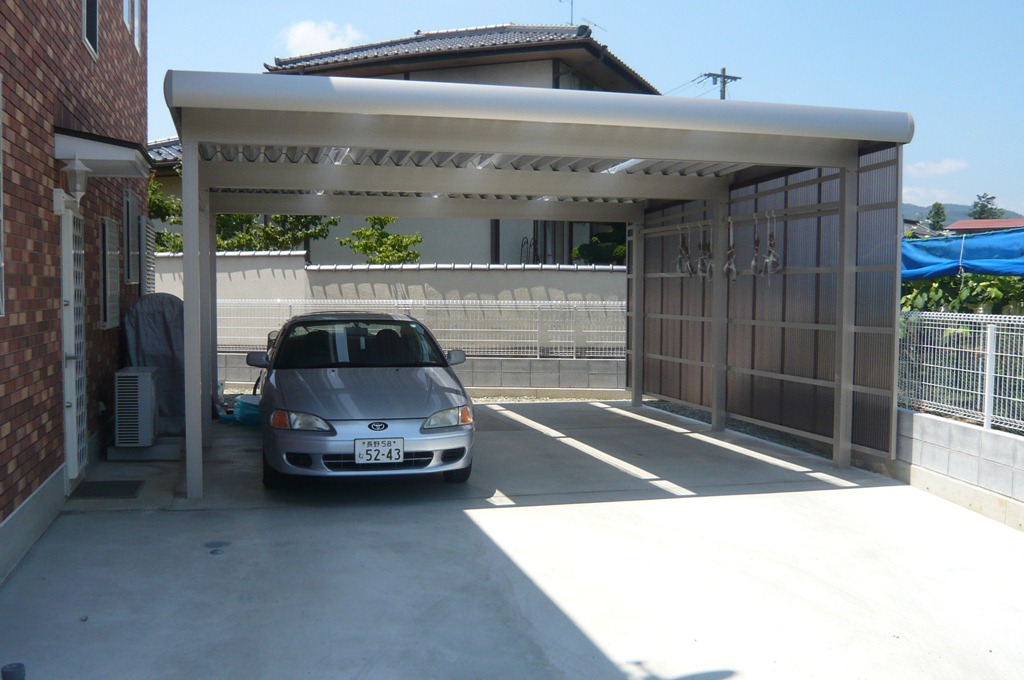 建物の北側には、手前と奥に四台分の車が止められるスペースを作り、奥に二台分の折半ガレージを立て、
