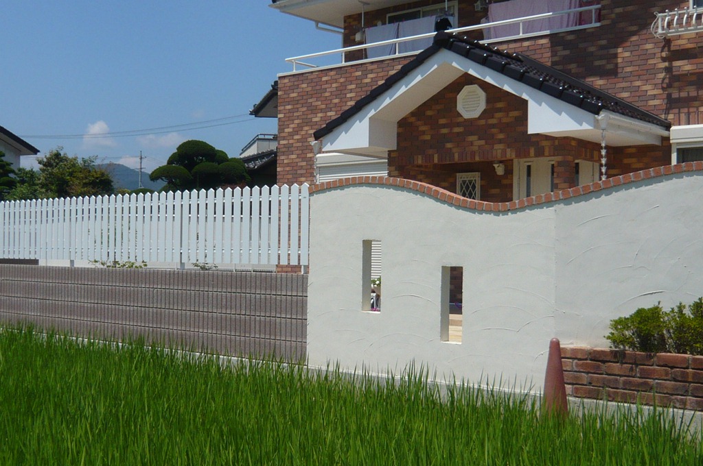 南側の境界は、化粧ブロックを積んだ上にアメリカンフェンスを取り付けていて、白い門柱とホワイトのアルミフェンス