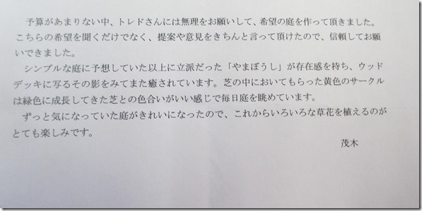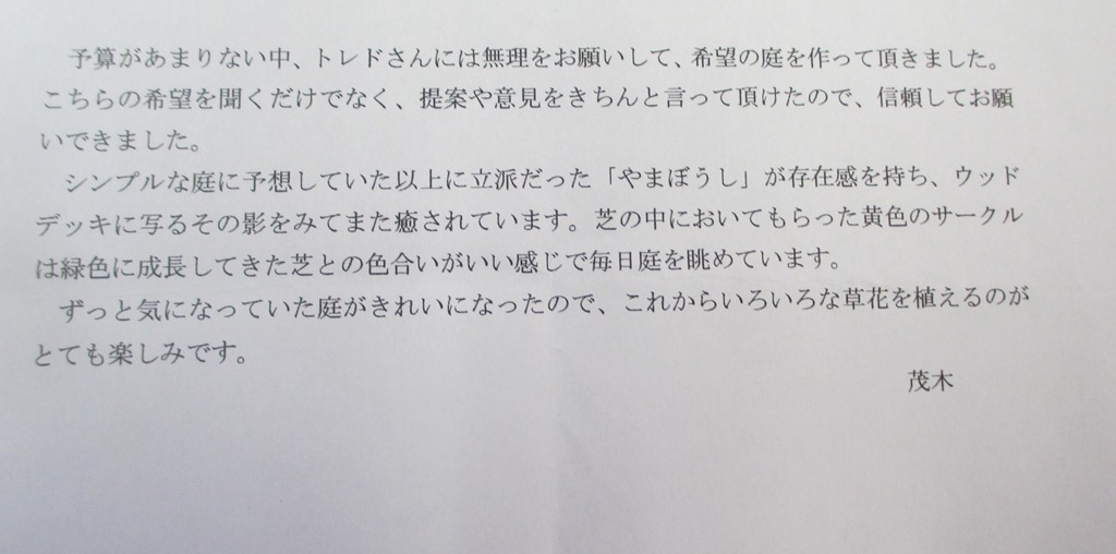 予算があまりない中、トレドさんには無理をお願いして、希望の庭を作って頂きました。