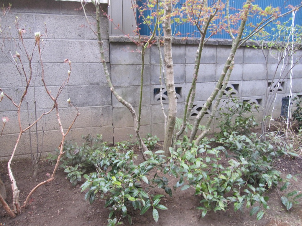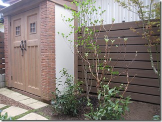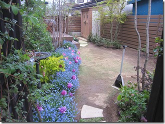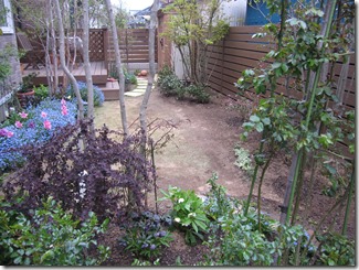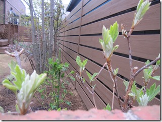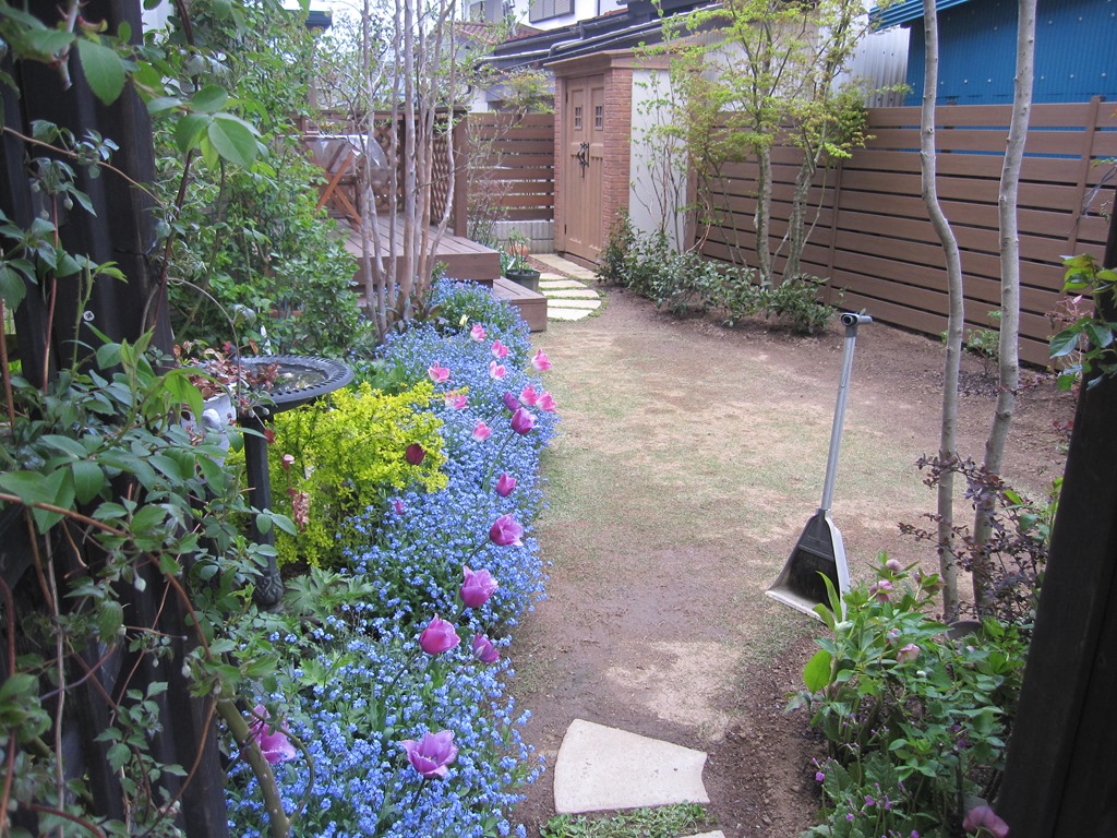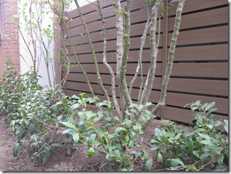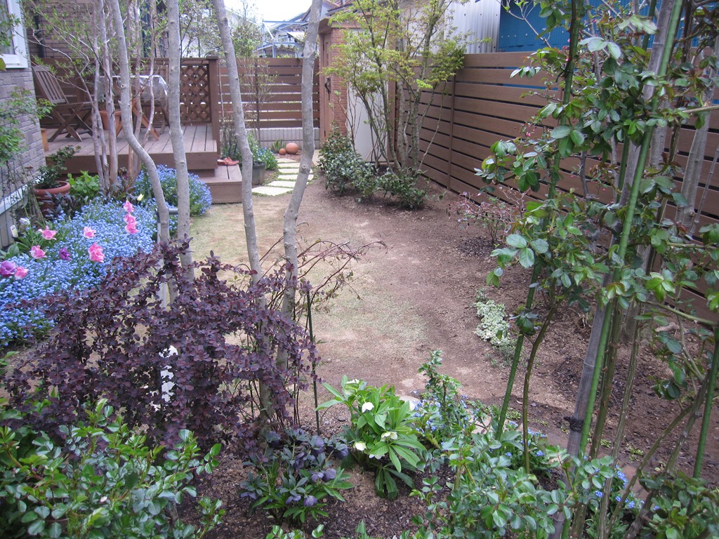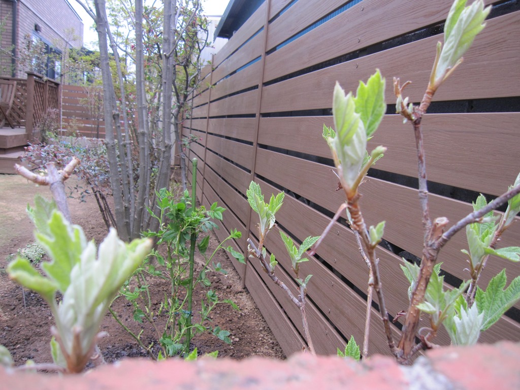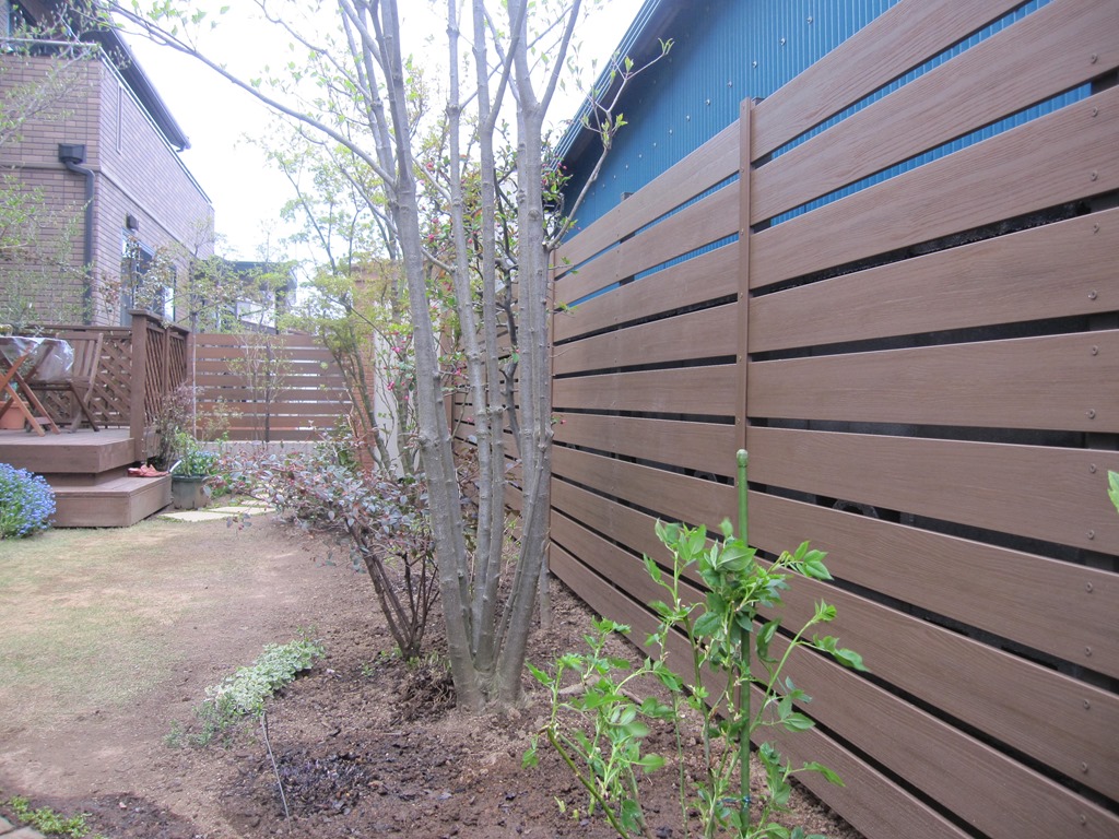 南側の境界の基礎の上にブロック塀が積まれていて、庭の雰囲気が物足りなかったのですが、ブロック塀を隠す高さまで、アルファウッドを地面ぎりぎりの高さから、10段張りで目隠しとしました。板塀の場合、視線を隠す為の施工が多いのですが、この現場は視線ではなく背景のブロック塀を隠したことになります。