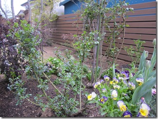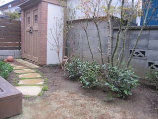 アルファウッド施工前の様子です。重石ブロックの積まれた塀が今迄にずっと気になっていました。木々が芽吹き草花が咲いてもやはり気なっていたのですがアルファウッドの施工が済んでからは全然気にならなくなりました。