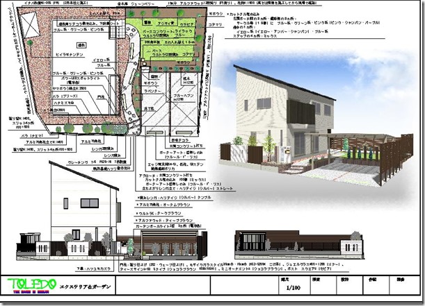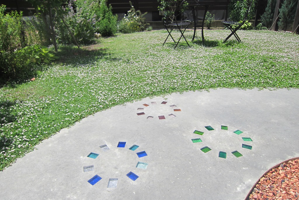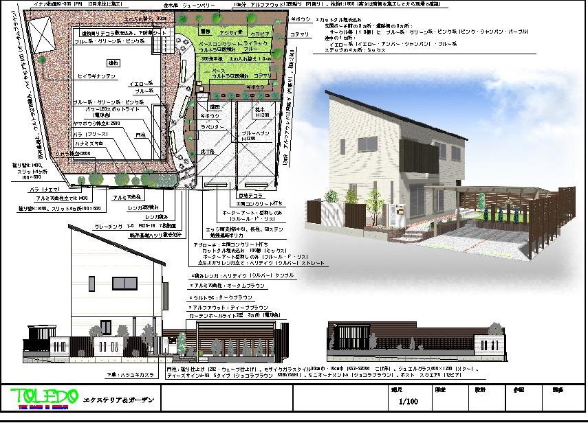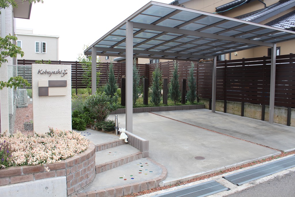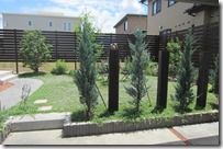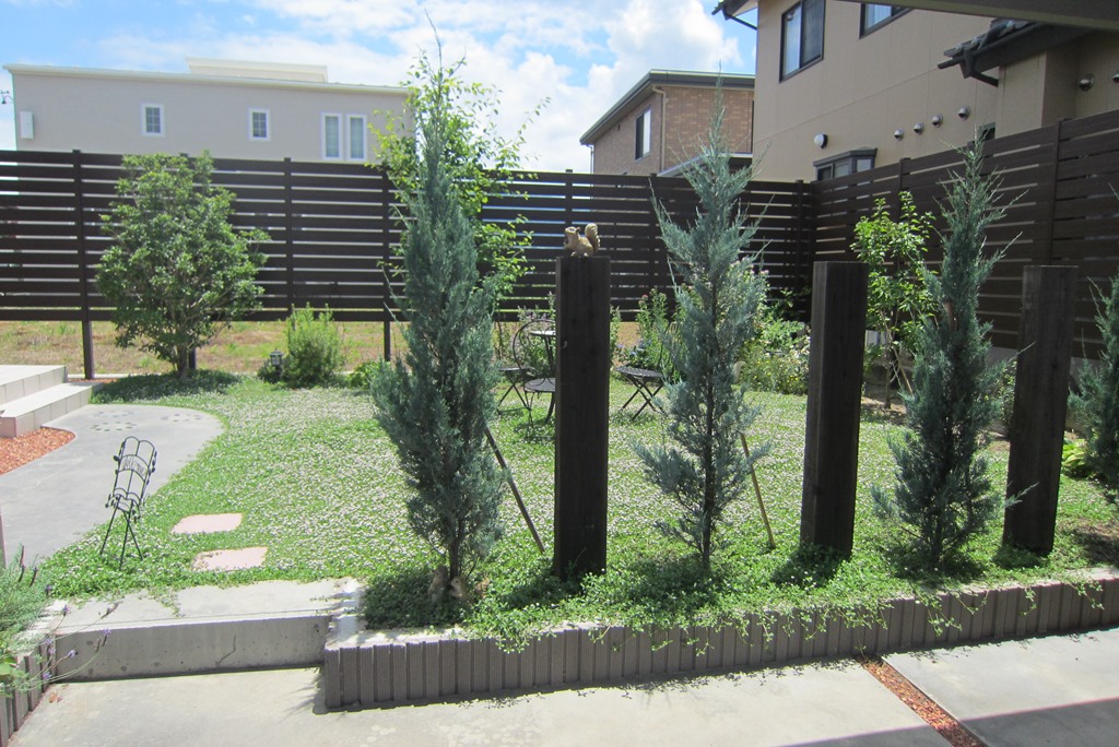 K様邸のデザインは、道路から敷地が高くなっているので、玄関に向かう西側面に、ジュエルグラスのある門柱を作り、アルミのポール塗り壁、アルミポール塗り壁と続けました。通路はコンクリート打ちにしてカットダルを埋め込み、縁にはボーダーアートで形押しをしています。駐車場と庭の境にはクリーンマクラギとコニファーで壁を作り、庭の側面に目隠し板(アルファーウッド)を高さ2m20cmにしてプライベート空間を作っています。芝生の代わりにクラピアを使用した庭です。 ガーデンデザイン 須坂市のエクステリア施工現場です。