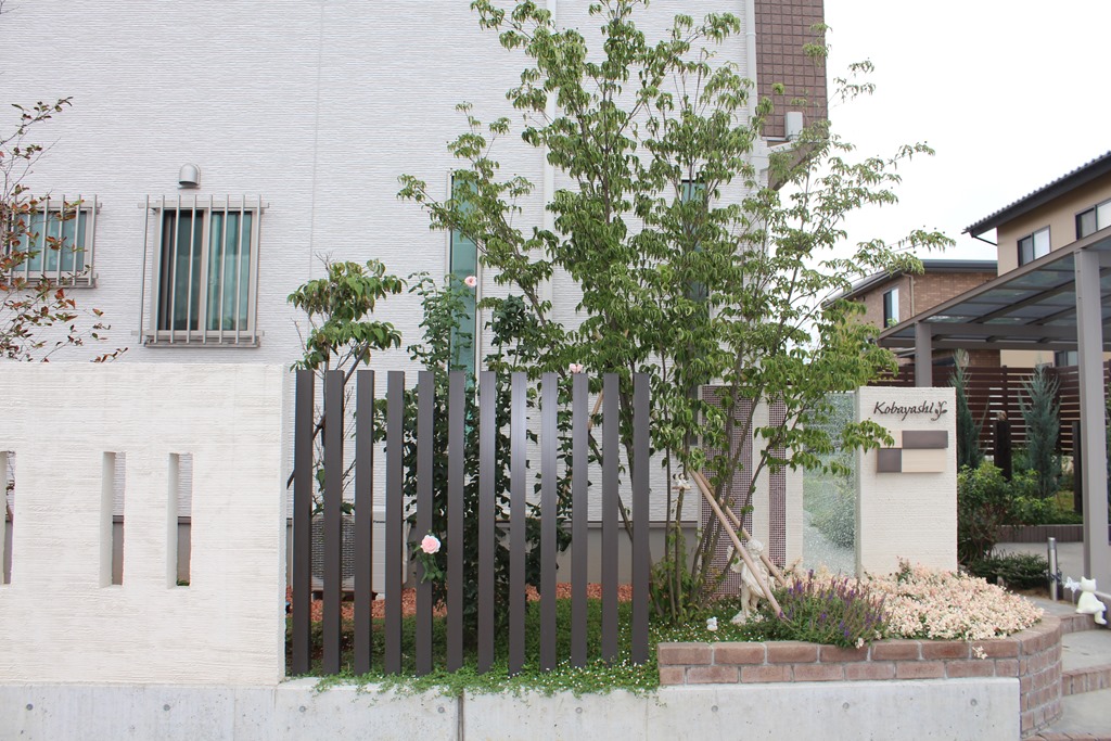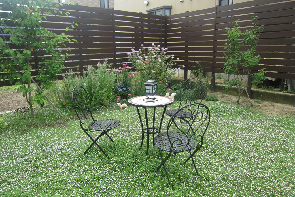 敷地が高いので、庭に出て寛げるように樹脂フェンスで囲い、手入れが楽なクラピアで庭を使えるようにした外構デザインです。