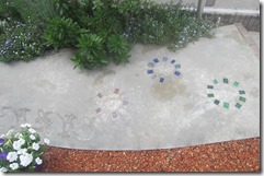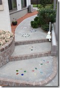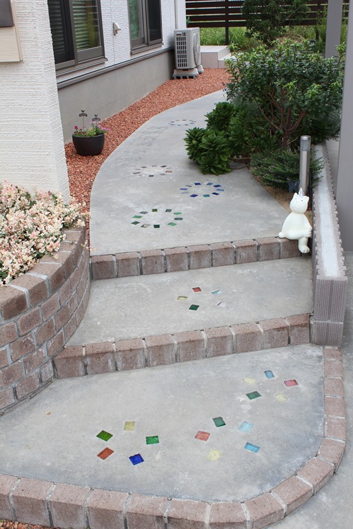 道路から数段の階段にして通路を作りました。立ち上がりにレンガを立ててコンクリートの床にはオリジナルのカットダルを埋め込んで仕上げました。