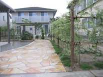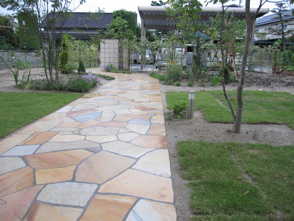 長いアプローチの外構デザイン。 2012-10-032018-11-12 by View all posts by toledo N様邸は長い通路に天然石を貼った現場です。門柱は20センチ角のレンガをミルクカラーの中にチョコカラーを縦に一列積みました。生垣を常緑のシルバープリペットで庭との境を囲いました。通路の両脇にLED照明を数カ所設置し、安心して歩けるようにしたガーデンデザインです。 長野市内のエクステリア施工現場です。
