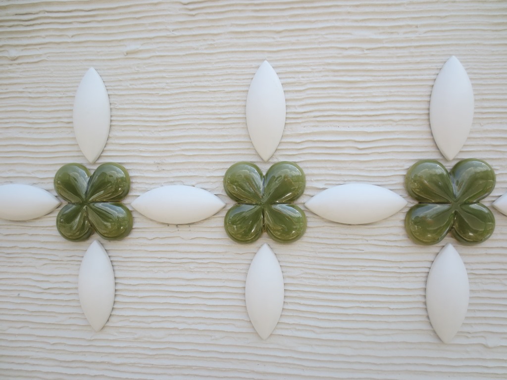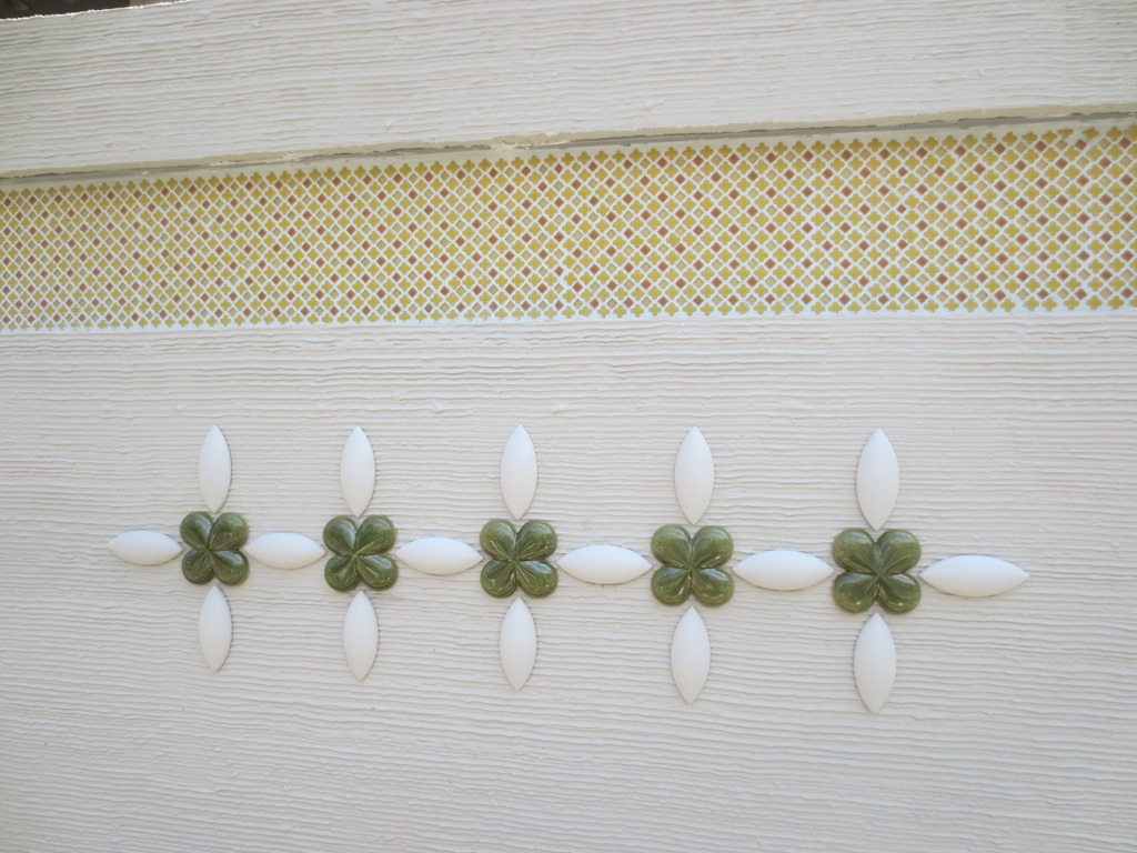 門柱を玄関前に作り、外からの視線を防ぐことと、家からの子供達の飛出し防止に最適な位置にあります。門柱を回り込むと左右どちらからでも玄関に入る事ができるようにデザインしました。 門柱は、ミッツモザイクフラワーミックスの貼られている部分を凹ませて作り立体感を出しています。壁にはフラワーサークルとハナのタイルを貼りアクセントにしています。物置が家の正面にあっても違和感を感じさせないのは不思議ですね。
