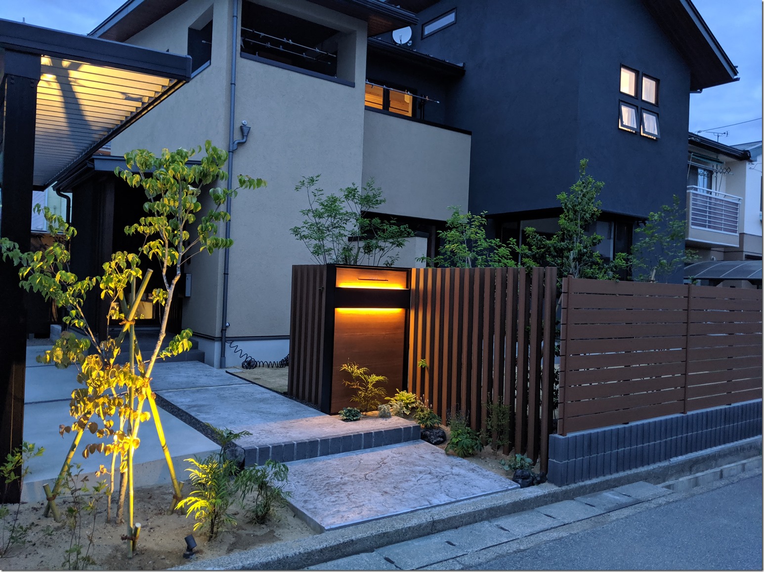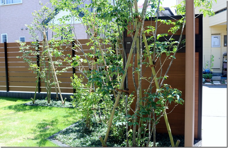 こちらのお宅は二世帯住宅で、外構をリフォームしました。大切に育てていたバラ・椿・カルミアなどを移動して移植し、既存の水鉢や板石なども再利用しました。そして不要な樹木などは思い切って伐根して、人工芝に変更し、樹木がなくなった所には樹脂製の目隠しフェンスを施工。外からの視線を気にせず、お庭に出る事ができます。
