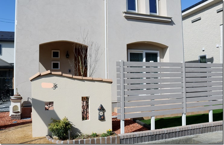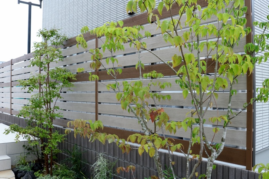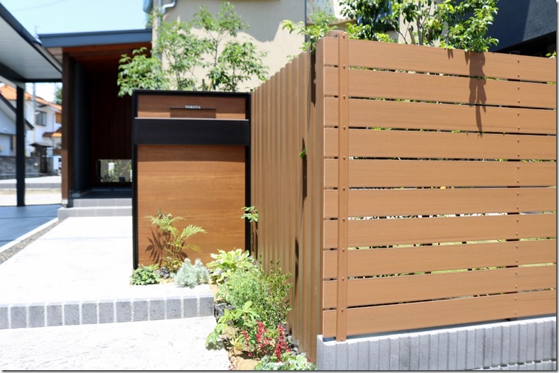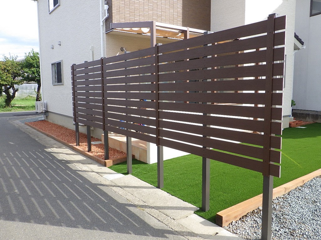 南側の隣地境界には化粧ブロックを3段積にしてディーズガーデン樹脂フェンス、アルファウッドで目隠し塀にしました。カラーは。ライトブラウンとマーブルブラウンの2色使いにして。