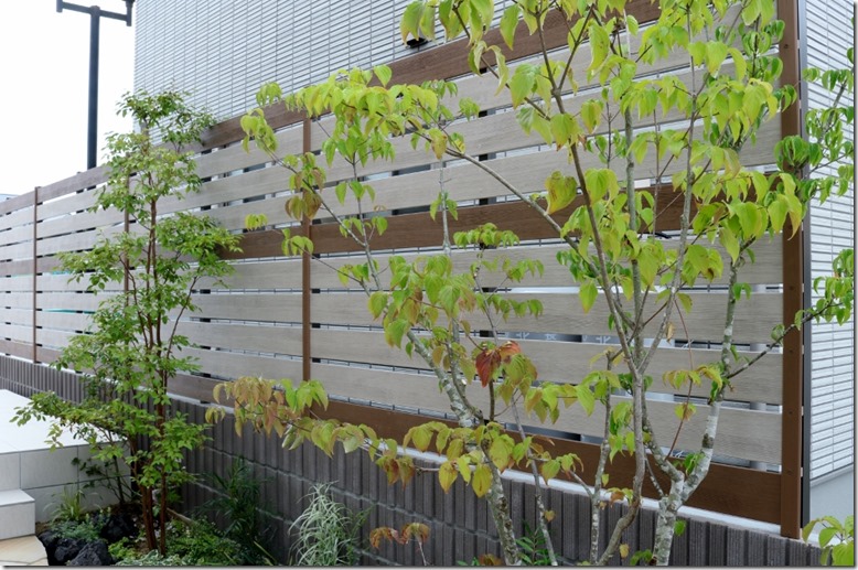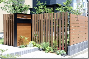 樹脂板は、ディーズガーデンの耐候性樹脂板アルファウッドのマーブルブラウンのカラーを10段、隙間は20ミリ空けで上から1400ミリを目隠しにしています。右側の画像が家の中から見た目隠しで左側が道路側から見たものです。