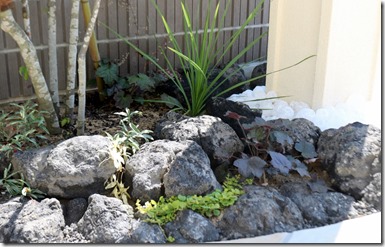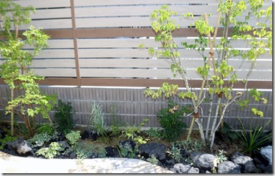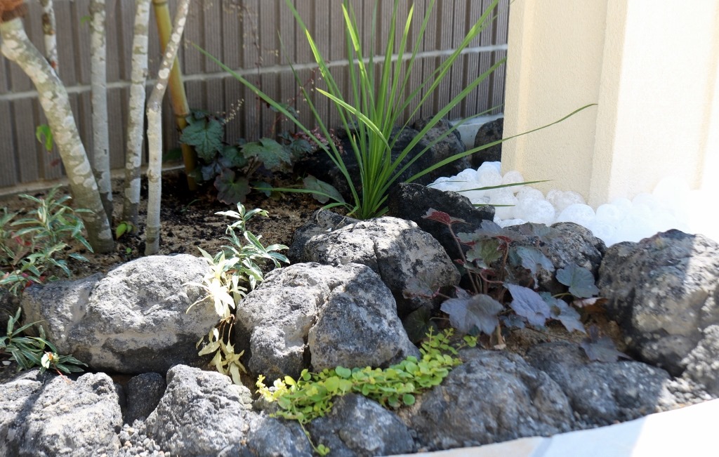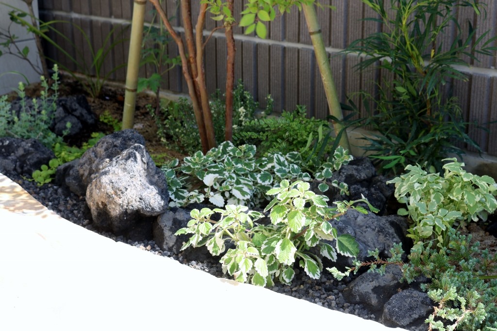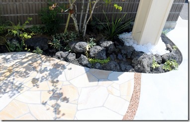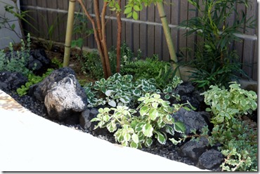 通路と隣地境界の隙間の空間は、浅間の溶岩石で花壇を作り、植木・下草をして仕上げました。