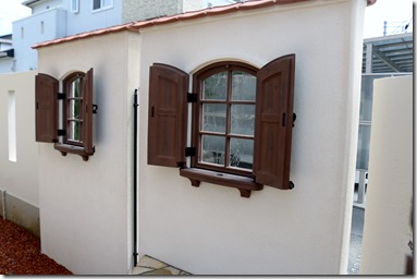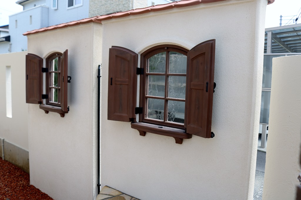 東側の境界にパティオウォールCを2棟並べて設置しました。 どちらにも瓦笠木を乗せ窓には鎧戸を取り付け2棟を繋ぐ為にスリットフェンスAを取付けました。左側の画像は家の庭側から見たもので右側の画像は道路側から見た画像です。