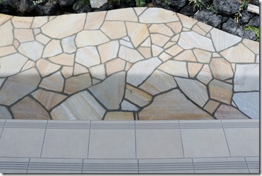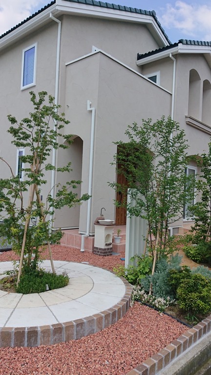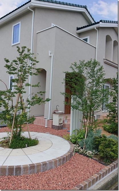 画像の左側のブラッドストーンサークルの真ん中には高さ2.5メートルの株立ちヤマモミジを植栽しました。