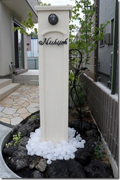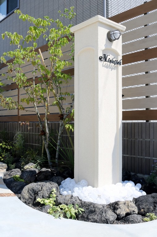 門柱をパティオ角柱Aショートで施工してエクステリア現場です。 サインはディーズサインA-07ブラックでサイン上にLIXIL美彩LED照明マリンライトを角柱の周りを浅間石で囲み中にリコストーン「ガラス玉」を敷き込み夜になのとLED照明点灯して素敵です。角柱の右側にサイドフェンスBの取付。