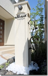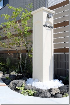 門柱をディーズガーデンパティオ角柱Aショートを立て、アルミ鋳物のディーズサインA-07、サイン上のエクステリア照明はLIXIL美彩マリンライト拡散グローブ付き、周りを浅間石で囲い中にガラス玉リコストーンを入れました。下にはLEDテープが組み込まれています。