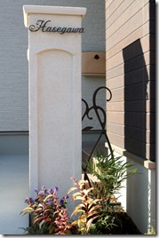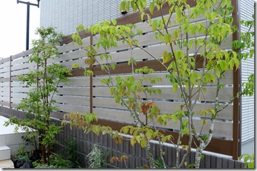 そしてポールの前には高さ2.5メートル株立ちエゴノキを植栽しアプローチわきには低木のアセビ・ヒュウガミズキ・ハツユキカズラ・
