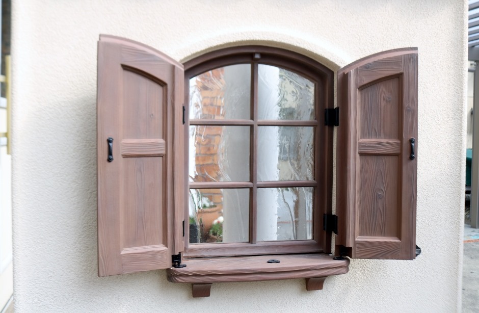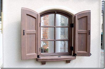 窓の付いたウォールCに窓の外枠鎧戸を取付けました。toledoでウォールC施工の場合は殆どが鎧と付です。 角柱の両側にアルミ鋳物のサイドフェンスを右側にEタイプ、左側にBタイプでデザインがことなるタイプの取付です。
