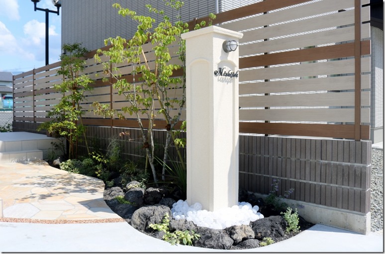 門柱をデイーズパティオで施工したエクステリアの現場の隣地境界の目隠しを既存基礎上に化粧ブロックを3段積にしてディーズガーデンのアルファウッドの耐候性の強い樹脂フェンスを10段張りで施工していますが、樹脂板のカラーを2色使って施工しました。