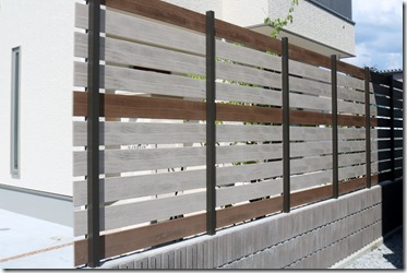 既存基礎上に化粧ブロックを2段積みにして、その上にメートルピッチでアルミ40角を柱を立てマイティーウッドを10段張り(外貼り)で施工しています。