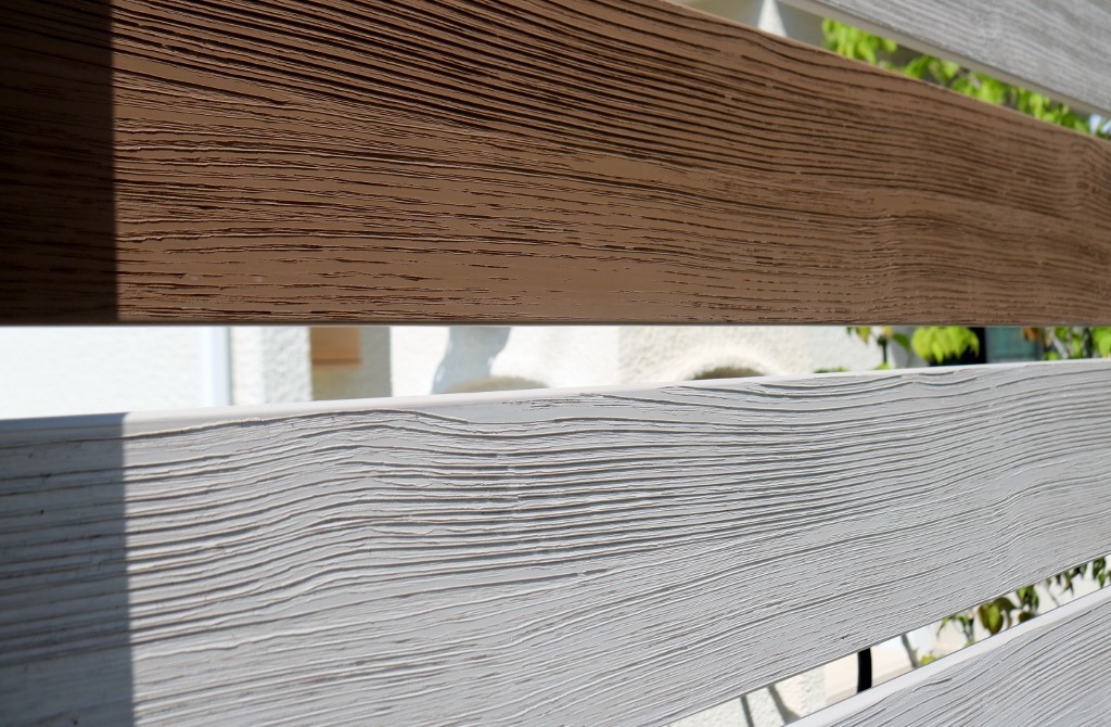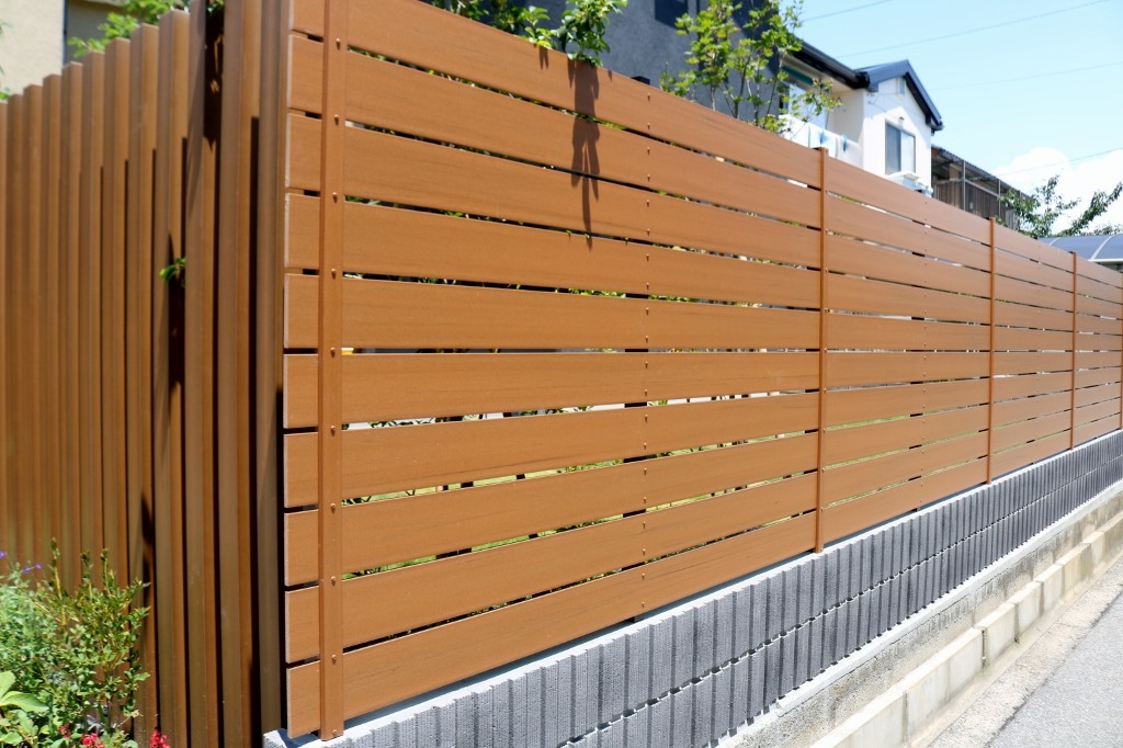 南側の隣地との境界に、耐候性樹脂フェンスアルファウッドを2色使いのツートンカラーで仕上げたエクステリアの現場です。