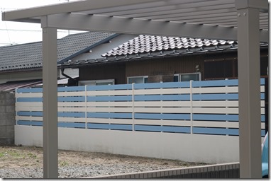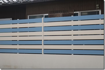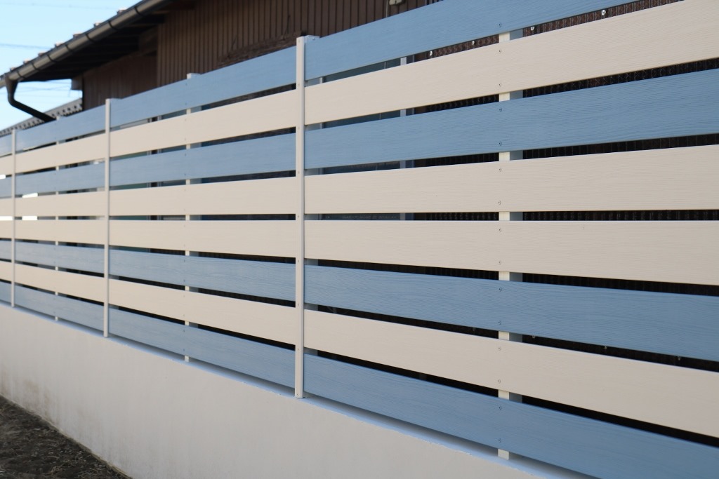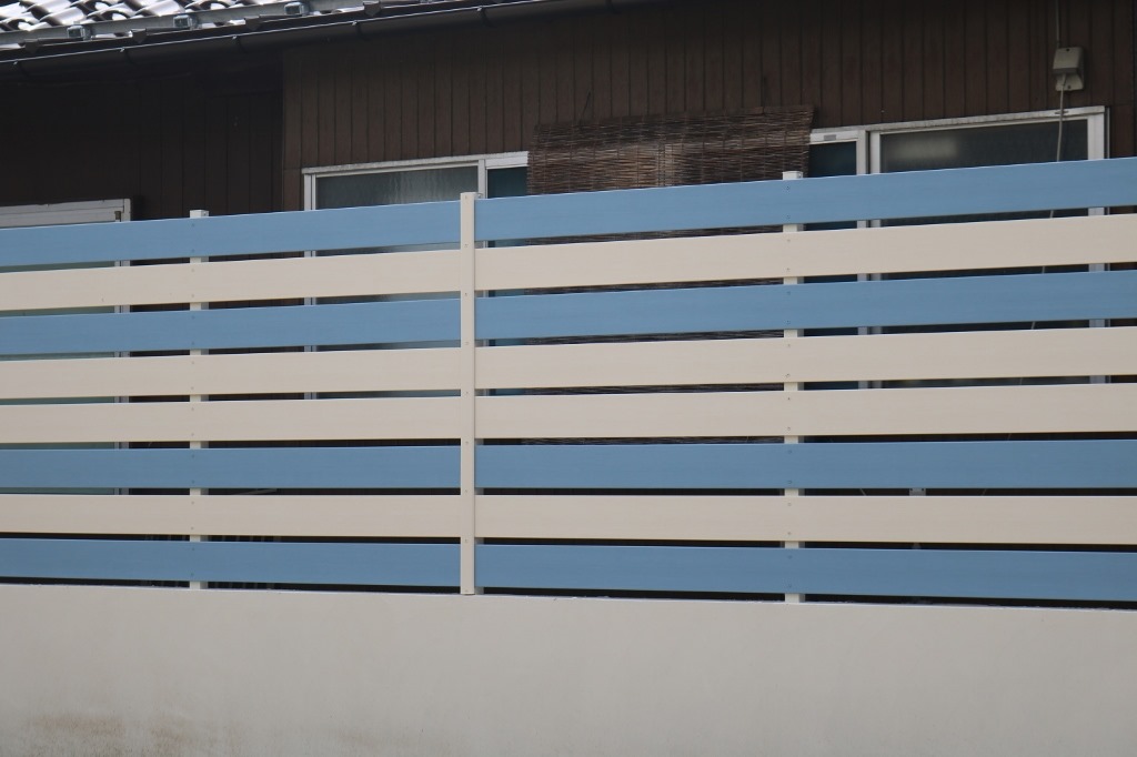 ディーズガーデン耐候性樹脂フェンス、アルファウッドのターコイズブルーとアイボリーの2色を4段・4段混ぜて施工しました。 こうする事で目隠しの他にデザイン性を持たせとても良い感じのエクステリア現場になりました。