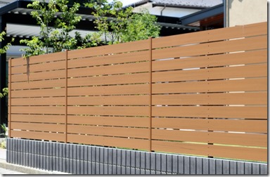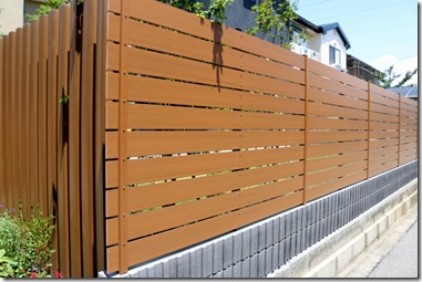 門柱をYKKルシアスウォールで造ったエクステリアの現場のブロック・フェンスに目隠しを兼ねたフェンスです。 門柱と一体感を感じさせる樹脂フェンスです。F&Fのマイティーウッド・シンプルブラウン木目調です。