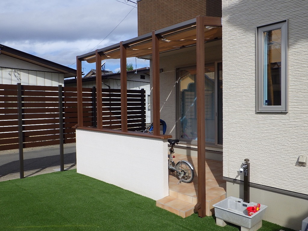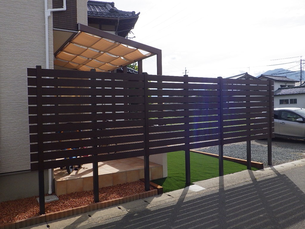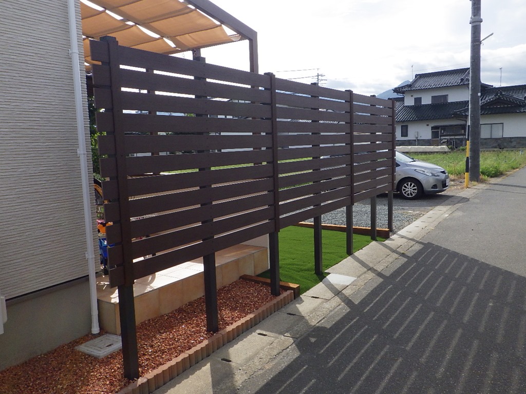 エクステリア工事で施工したリビング前のタイル貼りテラスが道路から近い位置にあり、寛ぐことの出来る空間造りとして道路側にアルミ70角柱を建ててデイーズガーデンのディープブラウンの樹脂フェンスアルファウッドを上から11段張りに施工した長野市内のエクステリア現場です。