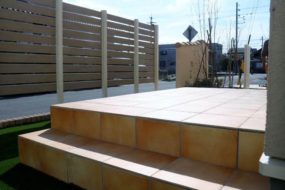 リビング前に造られたタイル貼りテラスは、アプローチからも続いていて部屋から通路から行く事が出来ます。