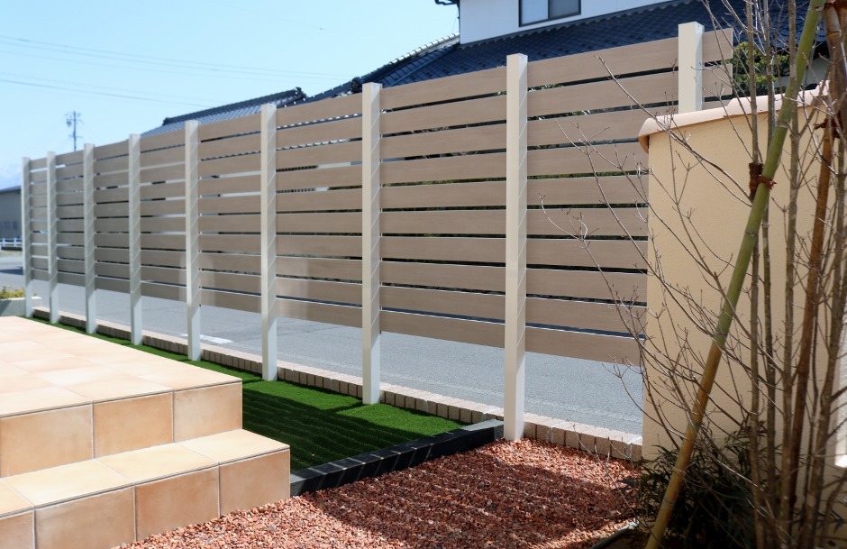 リビング前にタイルテラスを施工した現場は、テラス前が道路面に面していたので、目隠し塀をディーズガーデンの樹脂フェンスで高さをH-2300で施工しました。 樹脂板の場合は一枚一枚柱に取付けているので目隠しに必要な枚数を張れば下の方は張らなくても良いです、防犯の事を考える足元が見えるぐらいがいいと考えます。