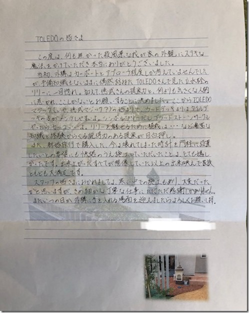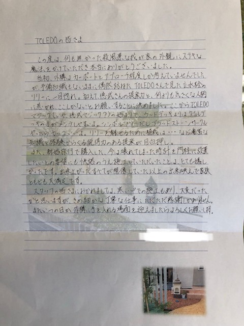 この度は、何もなかった殺風景な我が家の外溝にステキな魔法をかけていただき本当にありがとうございました。