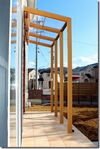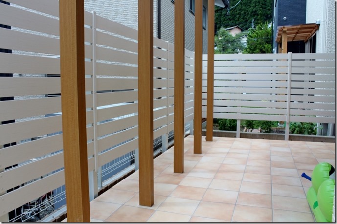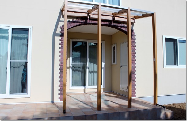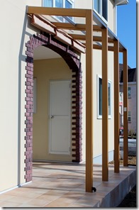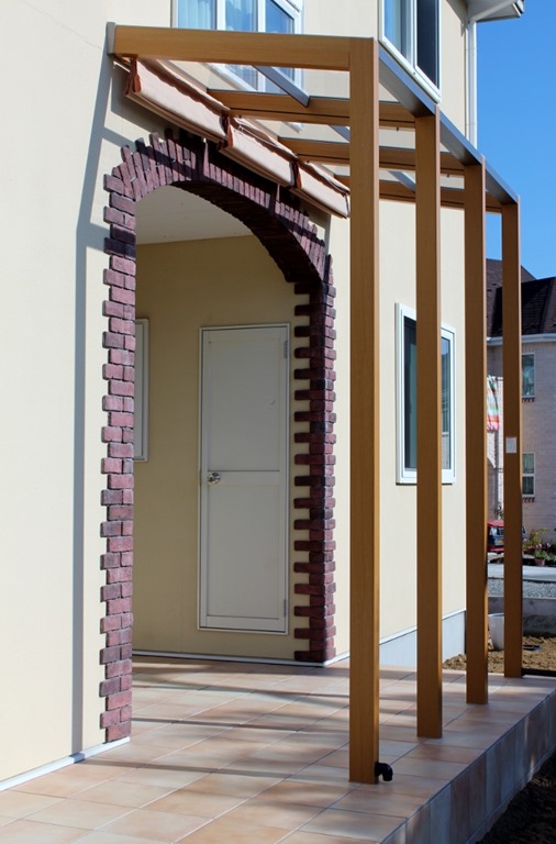 玄関前に塗壁の門柱を施工することで、目隠しにもなり子供達の飛び出しも防げるように工夫したエクステリアの現場です。 広い駐車スペースの中央あたりに玄関があるので門柱の左右どちら側からも玄関に入れるようにしました。 門柱の正面と同じ方向を向いているディーズガーデンのカンナ物置ですが、素敵なデザインで良く見える位置にあっても違和感がありません。