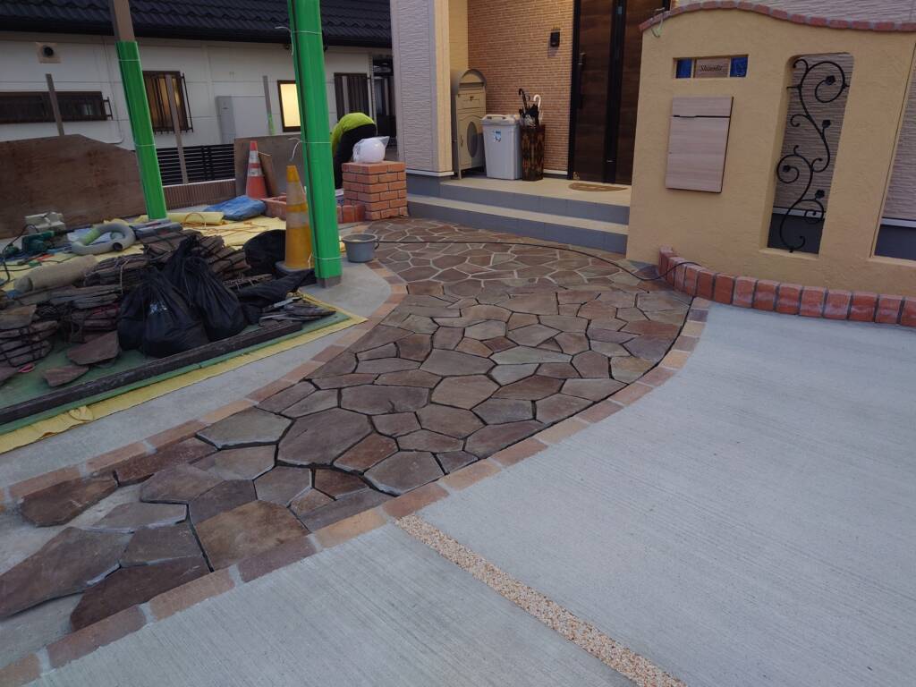 こちらの現場ではアプローチの石張り作業をしました。1枚1枚加工してバランスを見て貼り付けていくので時間のかかる作業ですが仕上がりはとてもかっこよくなるのでとてもやりがいがありますね!