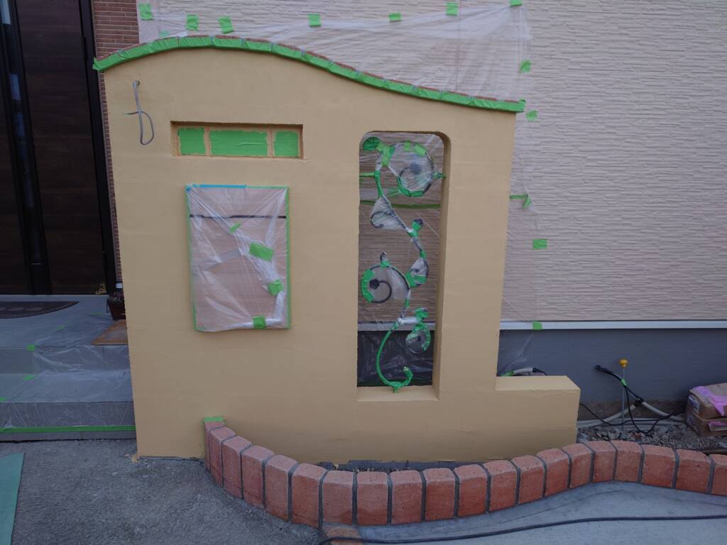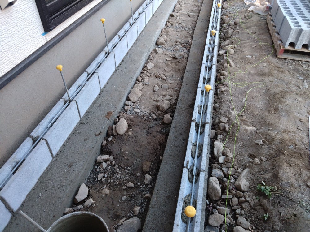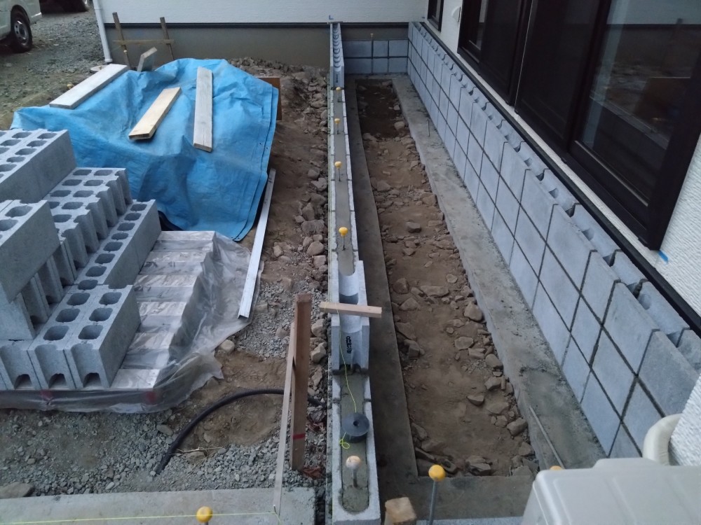 タイルテラス下地、門柱下塗り こちらの現場は先日から着手しているタイルテラスの下地を施工しています。 亜鉛メッキ鉄筋を組んで下地を施工してからブロックを据えていきます。今日はブロックベースの下地をコンクリート打設しました。タイルテラス工事は周囲にブロックを積み、中をコンクリート土間を作る工法と型枠を組んで施工する2種類あります。 こちらの現場は門柱の下塗りを施工しました。 ジョリパット塗仕上げになります。仕上げ塗前に下塗によりブロックの下地、色ムラを防ぎます。門柱の中にベネチアンガラス、ポスト、アールフィックスフェンスを埋め込んでいます。 長野市 松本市 塩尻市 外構エクステリア