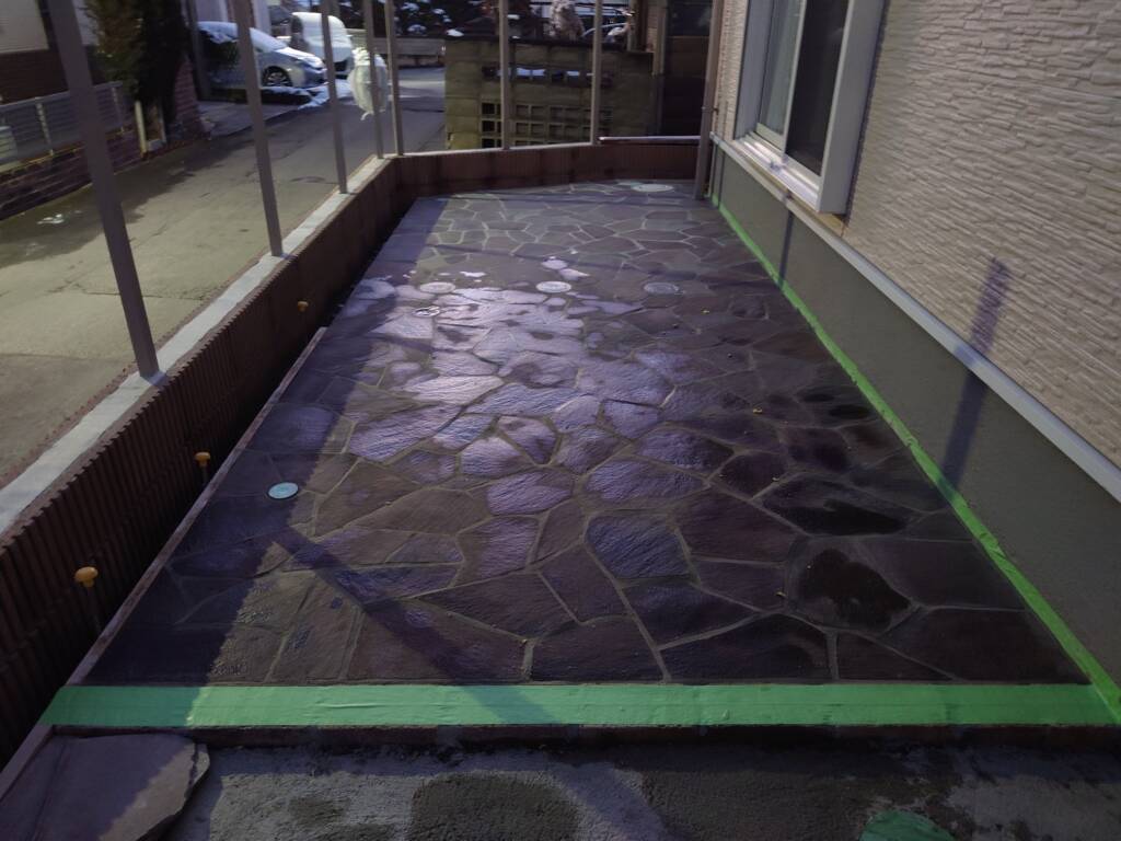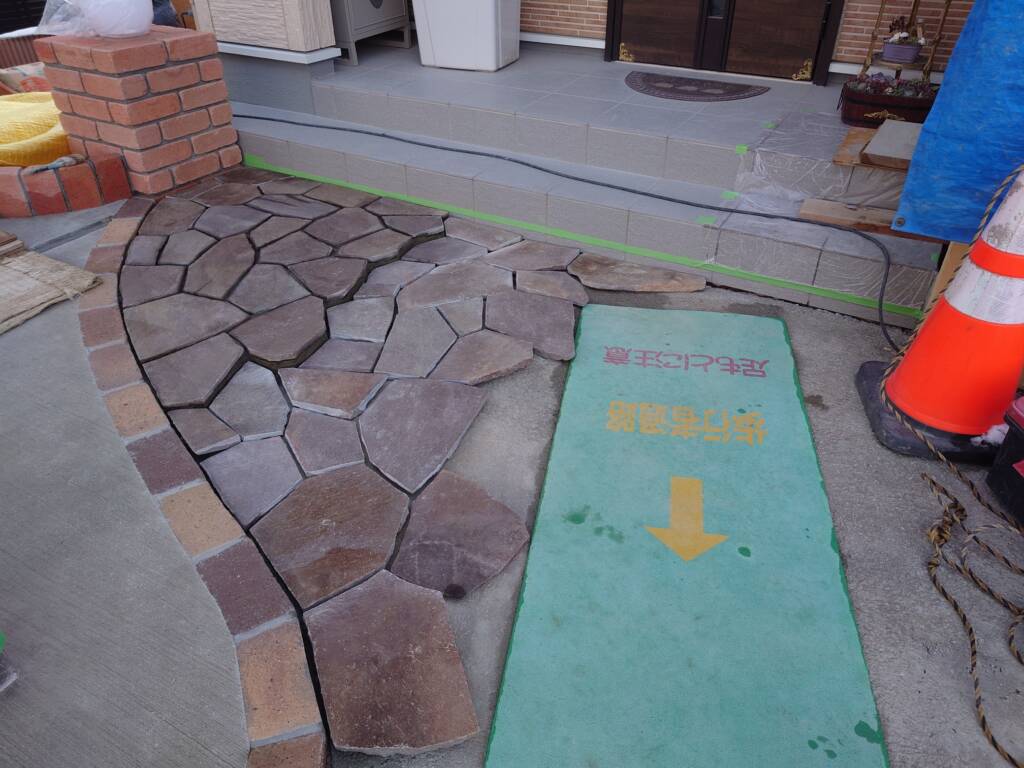 石張り 加工、目地入れ 12月3日(水) 今日はこちらの現場で、石張りの加工と目地入れ作業を行いました。写真がなく今回掲載したものはまだ貼り付け途中ですが、今は貼り終えています。まず目地を入れる前に、石の上のゴミを掃除してから作業を行います。目地には、普段のセメントとは別で目地用のセメントを使います。目地には、ゴム製のコテを使って押し込んで入れていき、スポンジで水拭きをして掃除と仕上げを行います。昼頃に雨が当たり、一度養生をして作業を中断しましたが、少し待機している間に降り止んでくれたので、無事に作業をやり切れました。