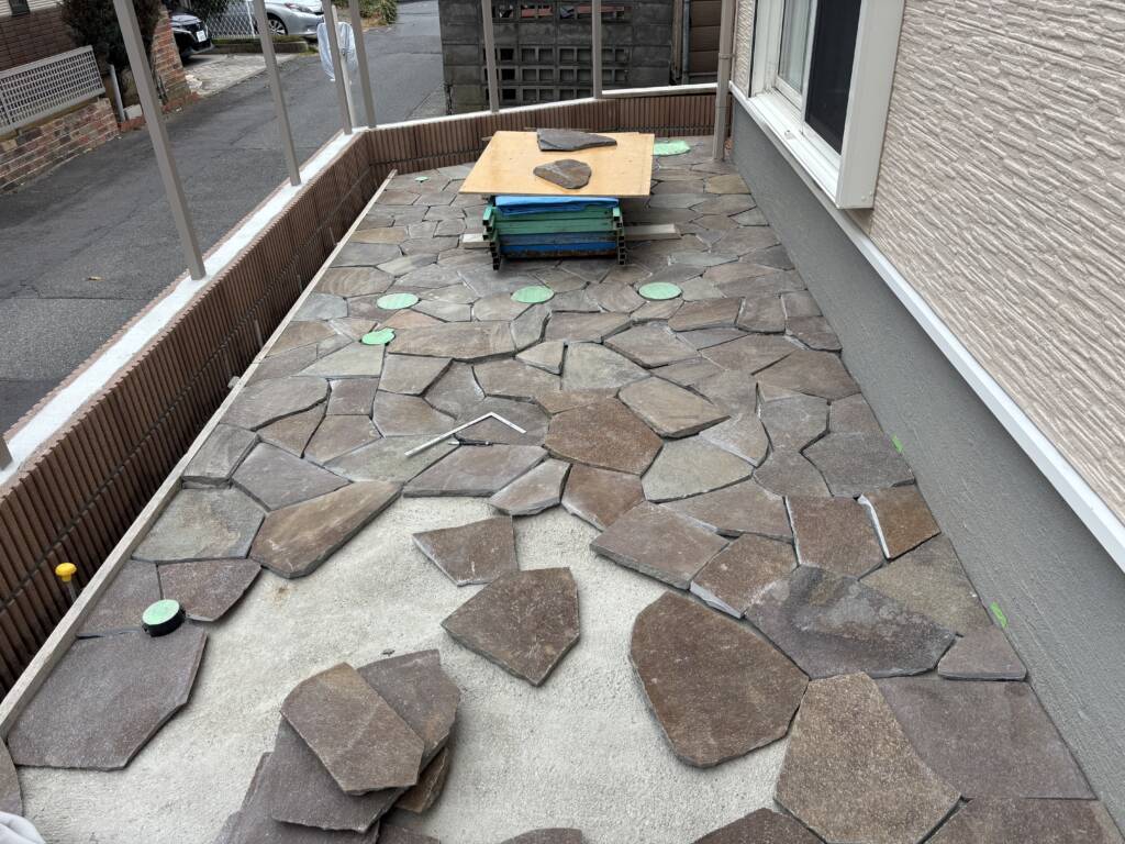 ジャワ鉄平…加工、張付け、目地。 12月4日(木) 長野市でも初雪が降り、いよいよ冬が到来。思っていた以上の降雪…前日に石張り箇所全面にしっかりとブルーシート養生を行ったため、養生を外しつつ除雪。石張りと加工、目地作業を進めて行きました。明日以降も氷点下予想のため、モルタルと目地の凍み上がり防止と雨、雪を防ぐブルーシート養生が必要不可欠な毎日が続きます。 長野市 松本市 塩尻市 外構エクステリア