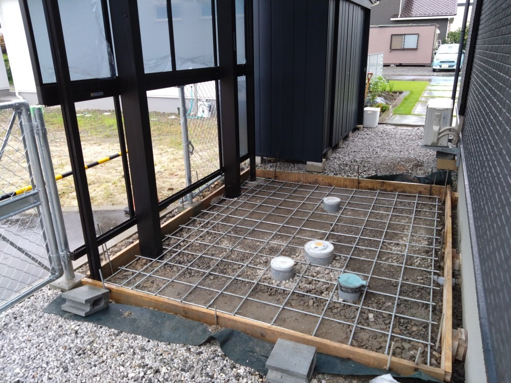 駐輪場にエフルージュを施工。サイドパネルも付けていくので、雨風を防ぎ安心の駐輪スペース。下は、土間コン枠組みを行い、亜鉛メッキ鉄筋を配筋。後日に、土間打設し、刷毛引き仕上げとなります。