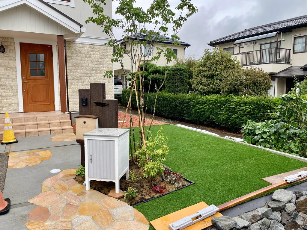 アプローチ横に人工芝と植栽。もう少しで完成となりますが、やはり緑が入ると、石貼りや門柱を引き立ていい感じです!