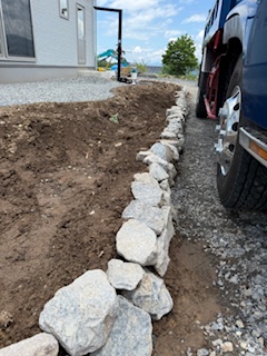 石積み 10月6日 (月) 今日の写真がなかったので以前石積み作業をした現場の紹介をします。内側にある土が流れてこないように石を積んでいきます。石の隙間から土が流れてこないように小さい石なども使っていきます。石の天端もそろうように高さを出し糸を張りそれに合わせ据えていきます。際の土は軽くたたいてかためます。最後に客土を入れ均し終わりになります。