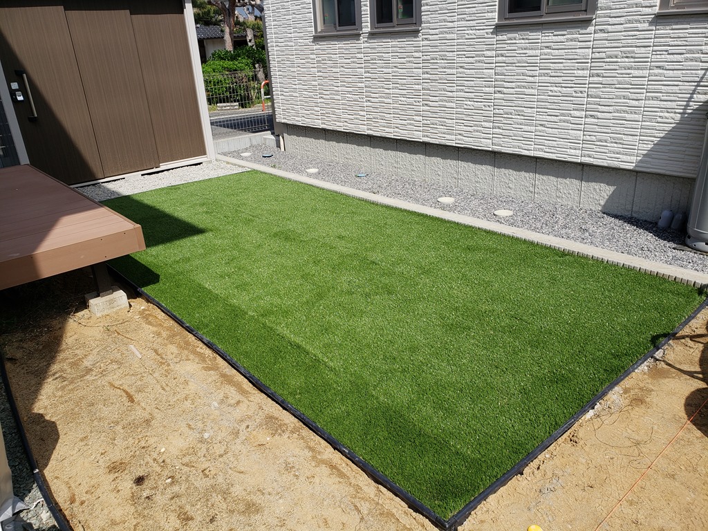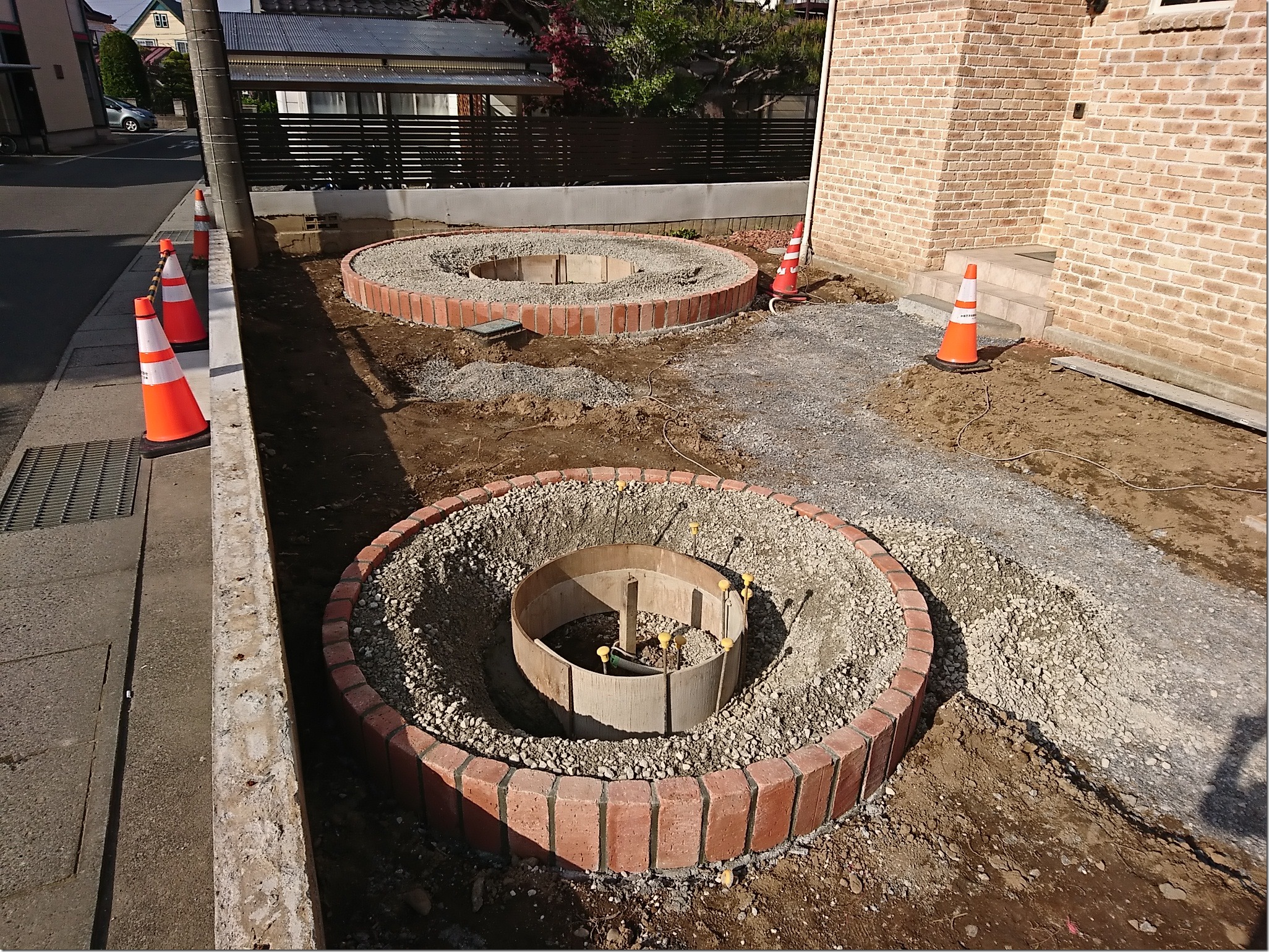 こちらのお宅では、サークルの形にレンガを据えていきました。綺麗な円を作るのは見た目以上に難しく、写真のようにいろいろな工夫をしながら作っていきます。最近は暑かったり寒かったり気候の変化が激しいので体調を崩さないように気をつけたいです。