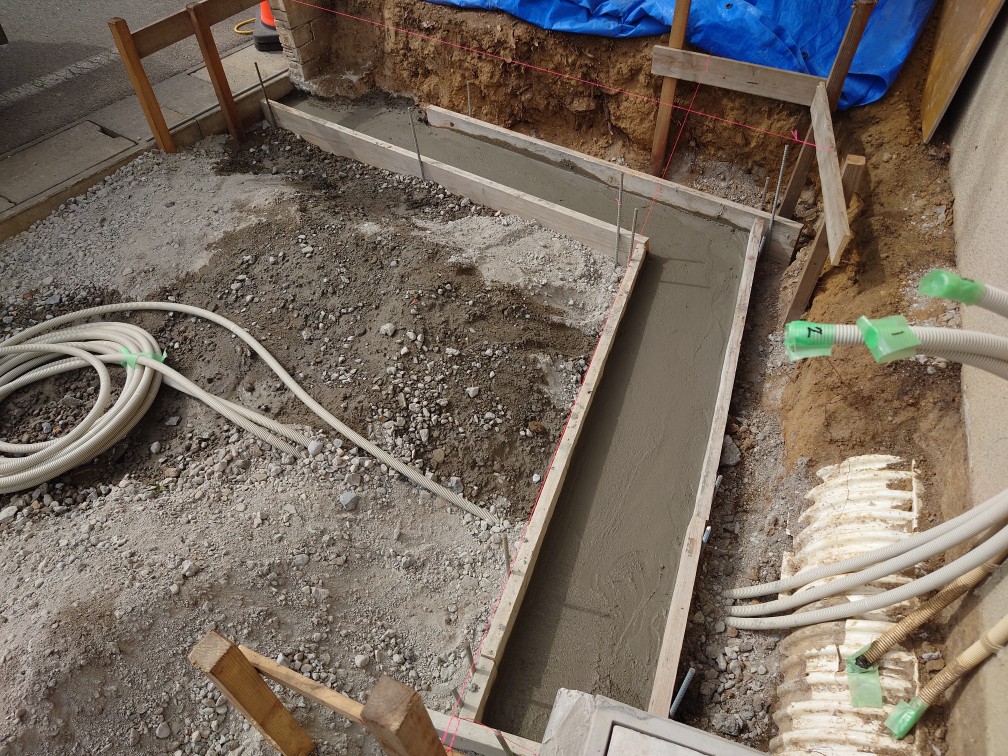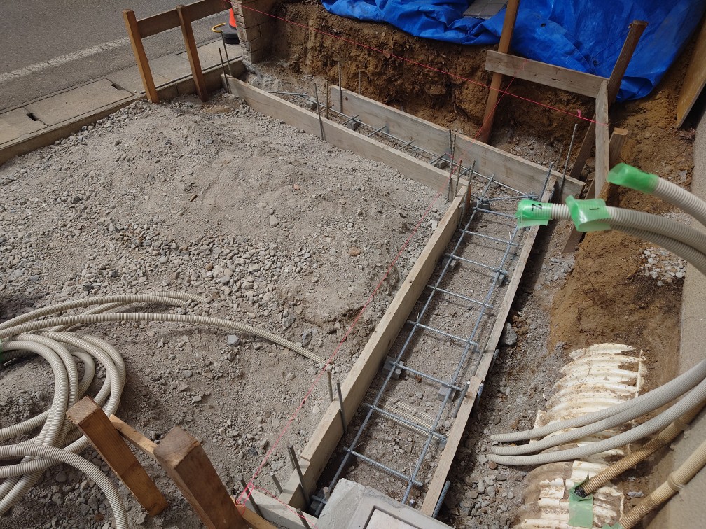 今日は玄関前での作業になりました。事前に打設したベースコンクリートに型枠ブロックを積んで基礎を作り、東洋工業のプレックスのノヴェルボーダーを積んでいきました。この商品を今回初めて取り扱うことになりました。素地ブロックに予め石材が貼り付けてあり、このまま積むことで表面が仕上がった状態になるというものです。持ってみるとタイルが貼り付けてある分重いです。通常の素地ブロックが20㎝あるのに対しノヴェルボーダーは15㎝と高さが少し低いです。重い商品を積み上げるので足場をしっかり確保しながら積んでいきます。亜鉛メッキ鉄筋を使用し錆にも強い門柱を作っていきます。